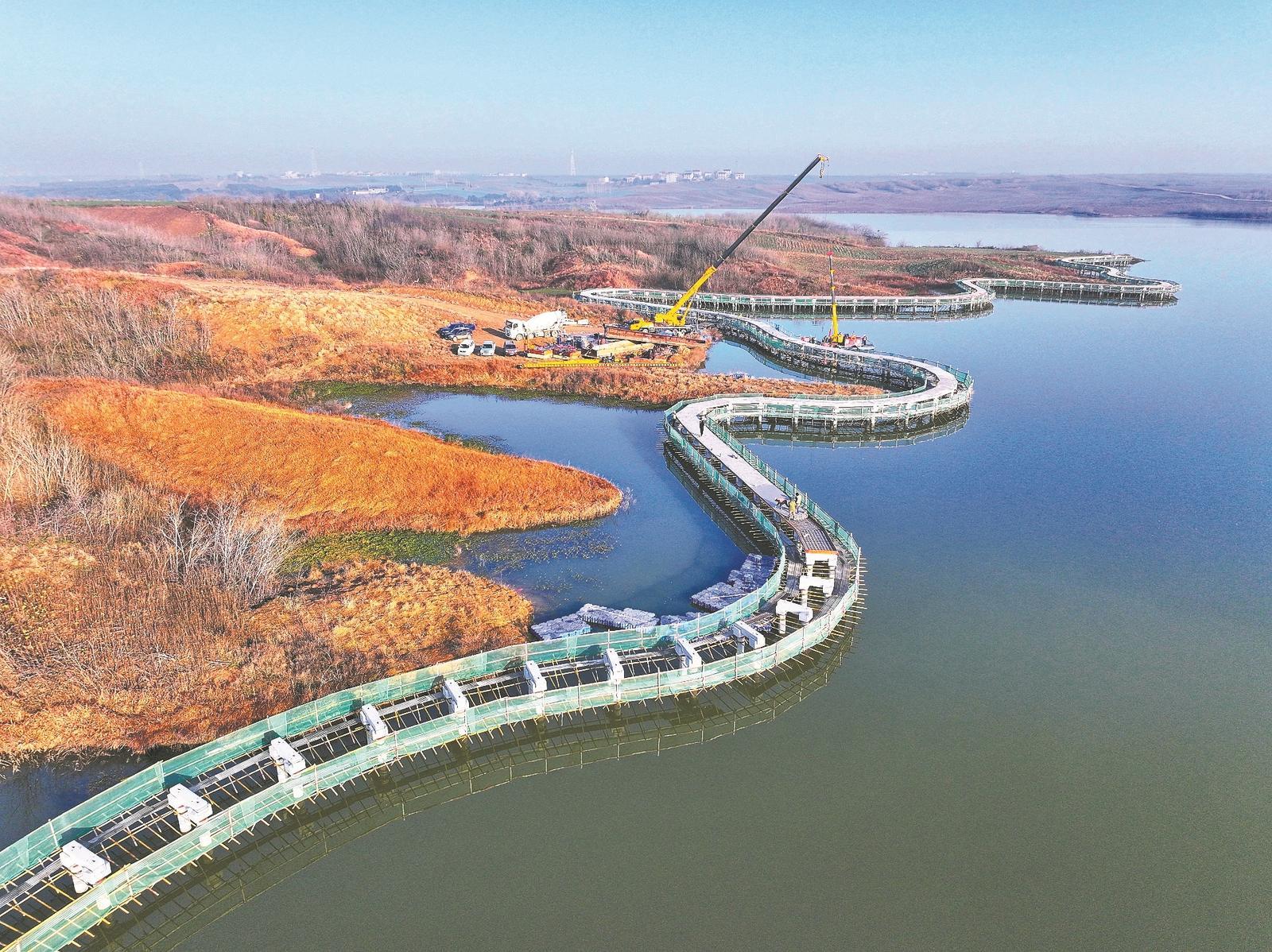 12月25日,工人们加紧施工普陀岩水库水景风景公路。该栈道位于樊城区乡村振兴旅游高速公路“一号线”起点附近,全长约1.6公里。当地积极推动“交通+旅游”融合发展,通过打造水景项目丰富旅游体验,吸引更多游客。 图片提供:全媒体记者 谢勇